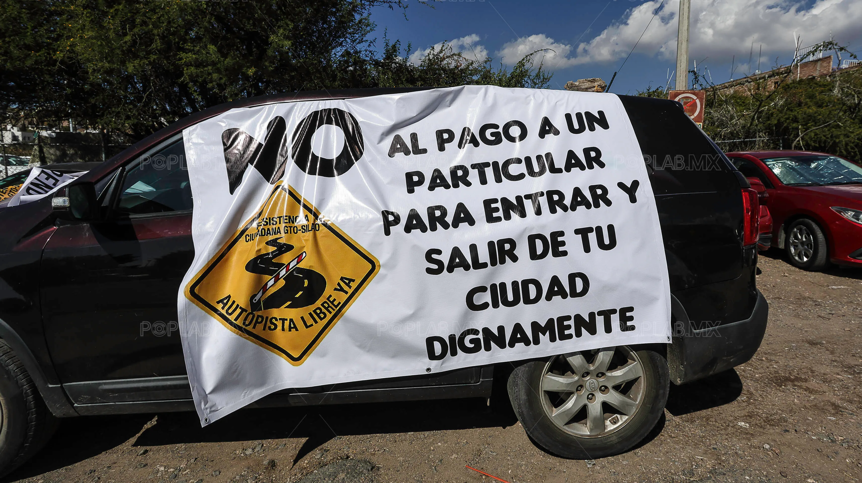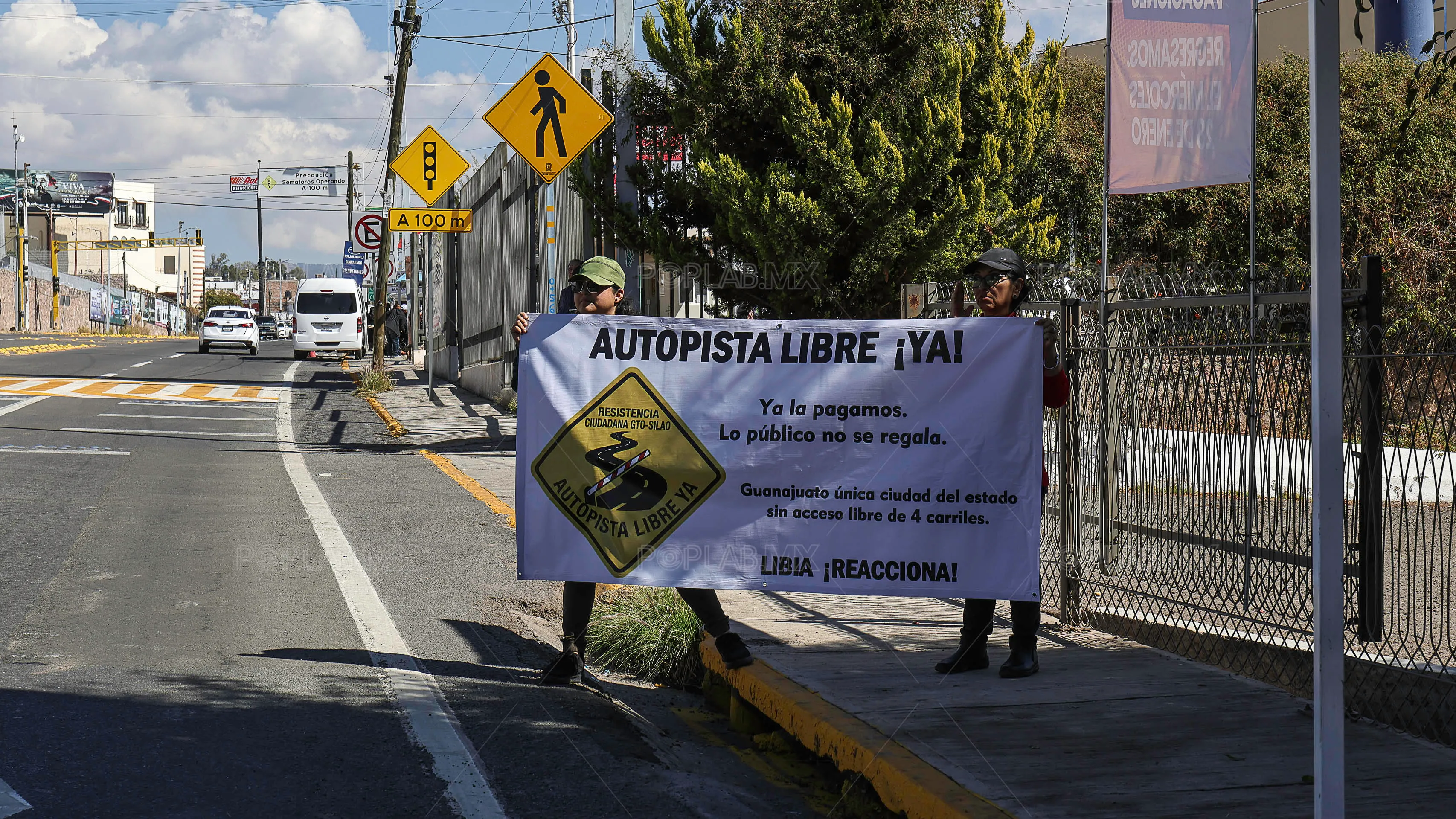 A la manifestación pacífica que convocaron organizaciones de la sociedad civil en contra del negocio que entregó el exgobernador Diego Sinhue Rodríguez Vallejo a dos empresas, llegaron unas 50 personas que comenzaron a repartir volantes a usuarios de la autopista.
