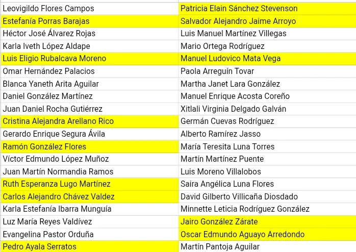Las tres personas aspirantes que no cumplieron con los requisitos fueron: Raúl Vega Vargas, Juan Manuel Tovar Alcántar y Juan Eduardo Luna Lira. Las personas destacadas en color amarillo en el listado corresponden a personas con lazos de parentesco o amistad con integrantes del Ayuntamiento o exfuncionarios municipales.