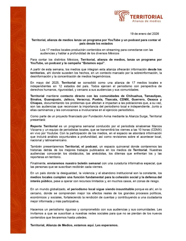 Para contar a México desde los estados, la alianza de medios Territorial, integrada por 17 medios locales independientes, entre ellos La Verdad Juárez, lanza un programa por YouTube, que se transmitirá los viernes a las 10 horas (CDMX) en vivo apartir de este 23 de enero; también un podcast y la campaña Estamos aquí
