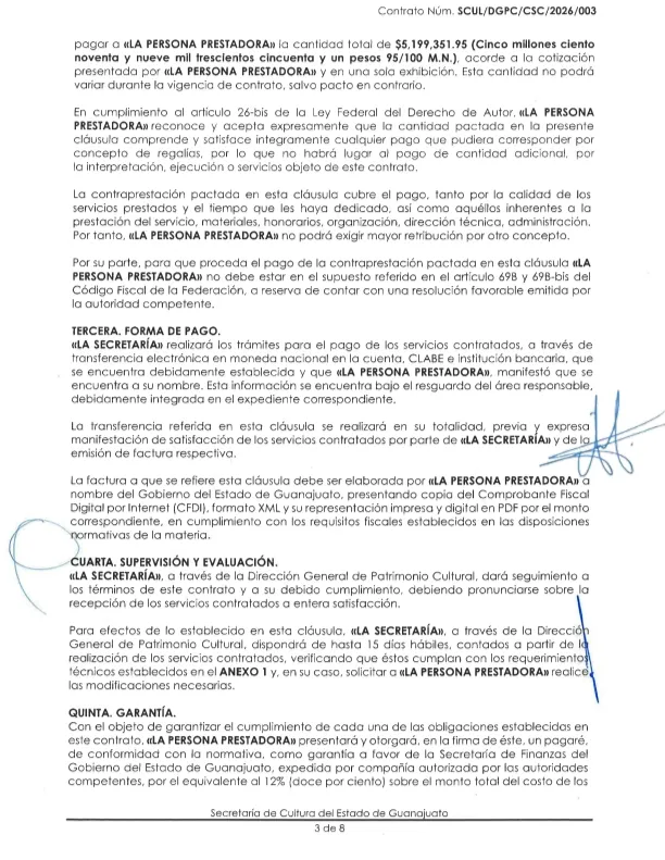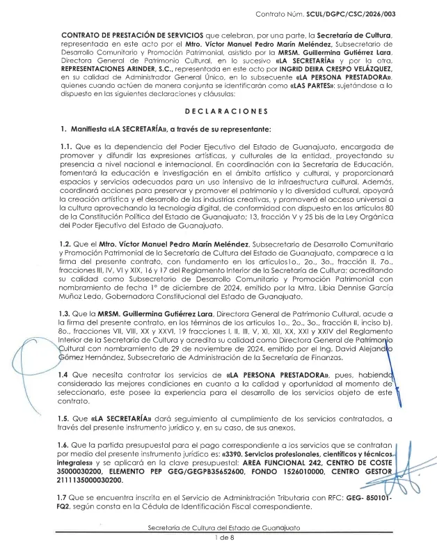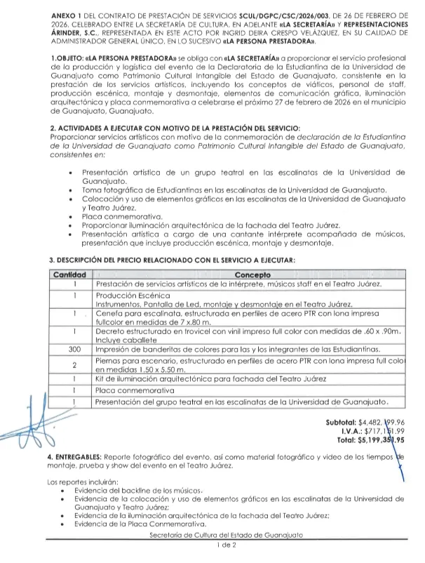 El contrato de prestación de servicios, celebrado entre la Secretaría de Cultura del Estado de Guanajuato y la empresa Representaciones Arinder, S.C., deriva de la partida presupuestal 3390 (“servicios profesionales, científicos y técnicos integrales”) e incluyó materiales, honorarios, organización, dirección técnica y viáticos de la intérprete, sus músicos y el personal del staff.